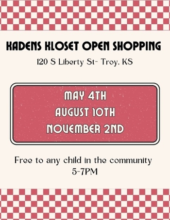 Kaden's Kloset Open Shopping Dates are posted on the attached flyer from 5-7 PM.