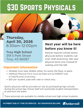 Amberwell will give sports physicals to Troy Middle/High School students that will be attending school next year in Grades 7-12 on Thursday April 30th at 8:30 AM. The physical will cost $30 and can be paid by Cash or Check (check made out to Amberwell).