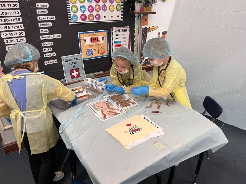 The last few weeks the first graders have been learning all about the human body. They learned about 5 systems (skeletal, muscular, circulatory, nervous, digestive), germs, 5 key ways to stay healthy, and the food pyramid. They ended their unit with “Doctor Day” to put what they learned into practice!