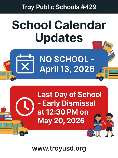 IMPORTANT CALENDAR CHANGES!!!! Please make sure you are subscribed to the USD 429 Troy School Calendar on our website at www.troyusd.org for all the calendar changes and that you review the school calendar on the website often for . . .