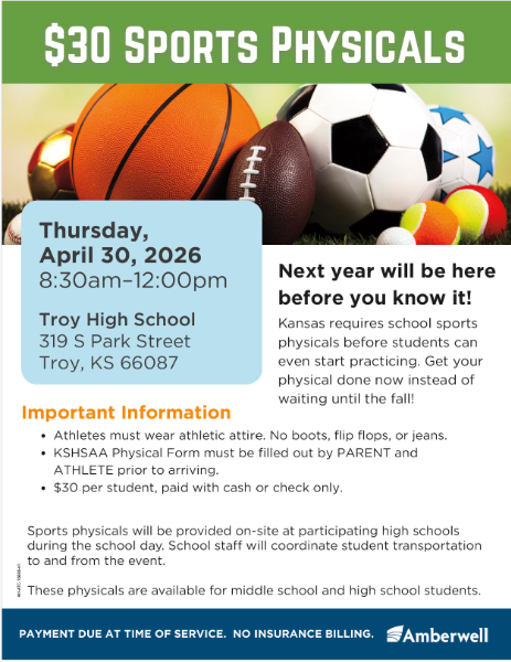 Amberwell will give sports physicals to Troy Middle/High School students that will be attending school next year in Grades 7-12 on Thursday April 30th at 8:30 AM. The physical will cost $30 and can be paid by Cash or Check (check . . .